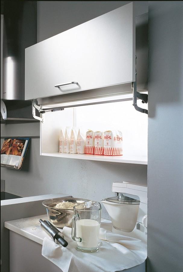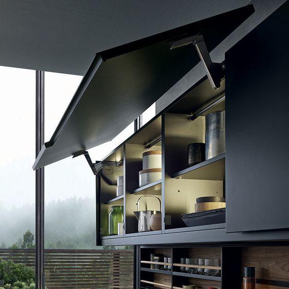 吊柜在国内厨房中并不少见,不过却是五金应用最少的一项,因为大多数人就是拉开柜门扔点不常用的东西进去,连收纳都很少。