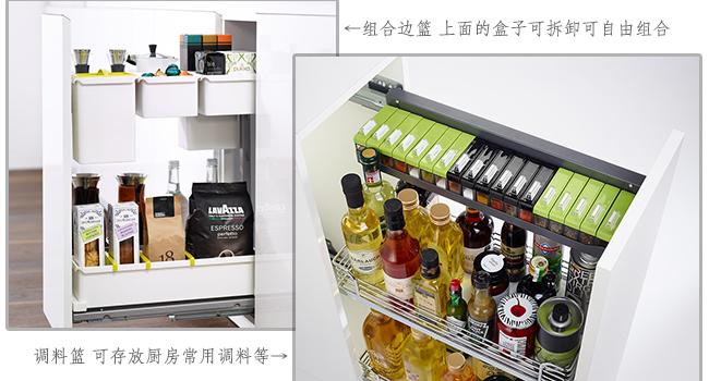 几乎是橱柜的收纳担当,也是最实用的一项。像四边篮(开门式)、三边篮(抽屉式)、水槽拉篮(用于水槽下方)、地柜连动拉篮、嵌入式垃圾桶、窄边篮(一般用作调味品收纳)等。