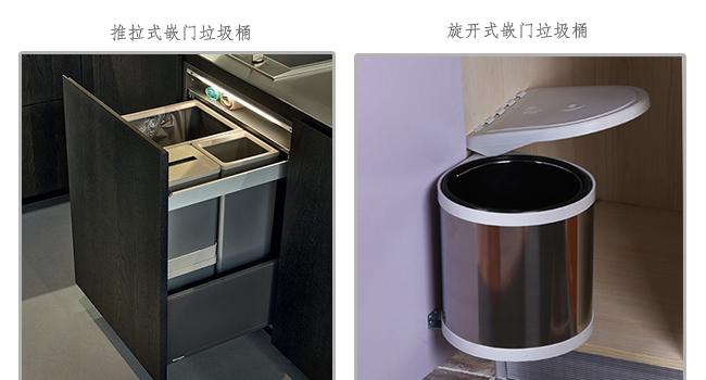 一般嵌入式垃圾桶都是嵌门式,与门连动,推荐搭配反弹滑轨,膝盖顶一下就能打开,放完就关上,腾不开手也能处理。